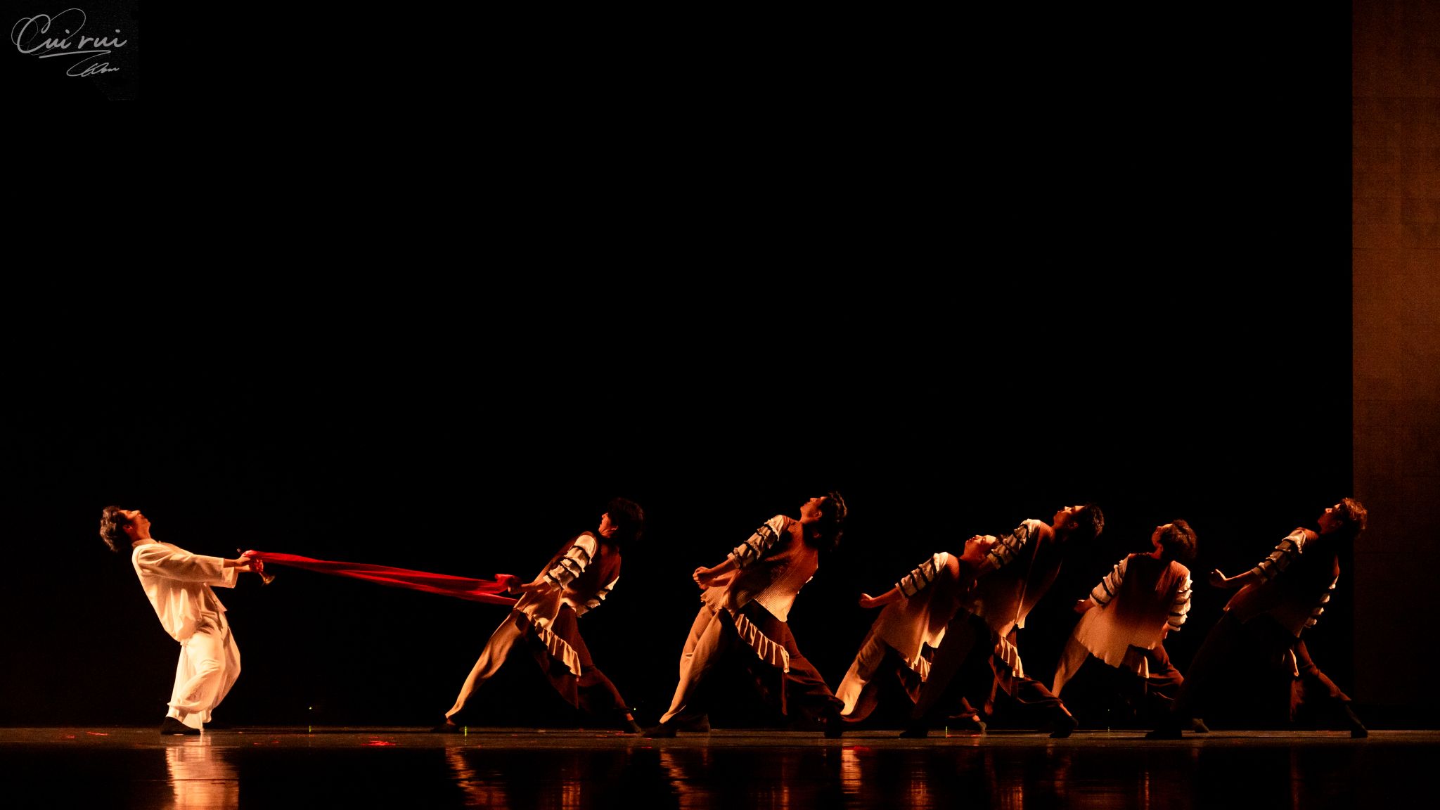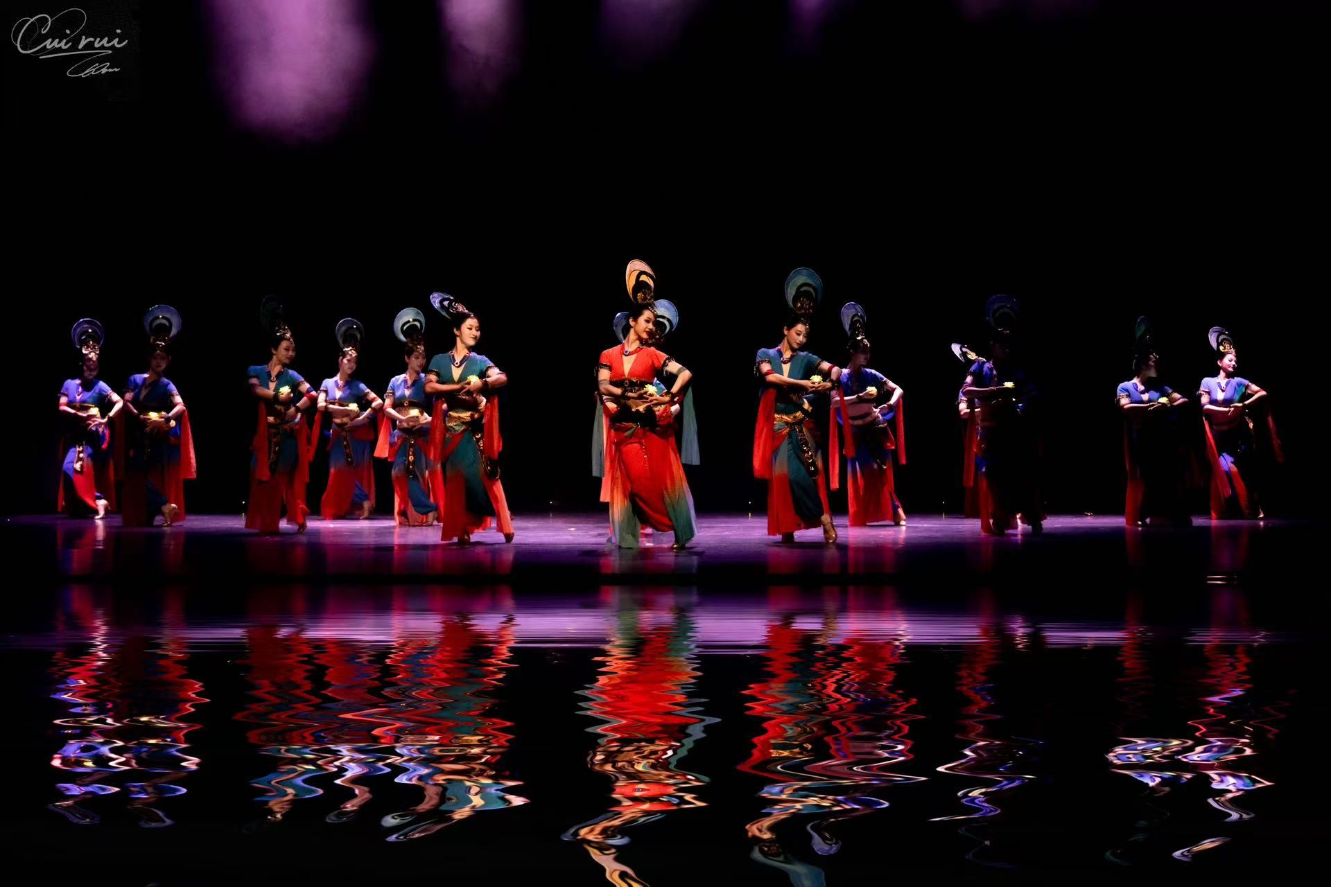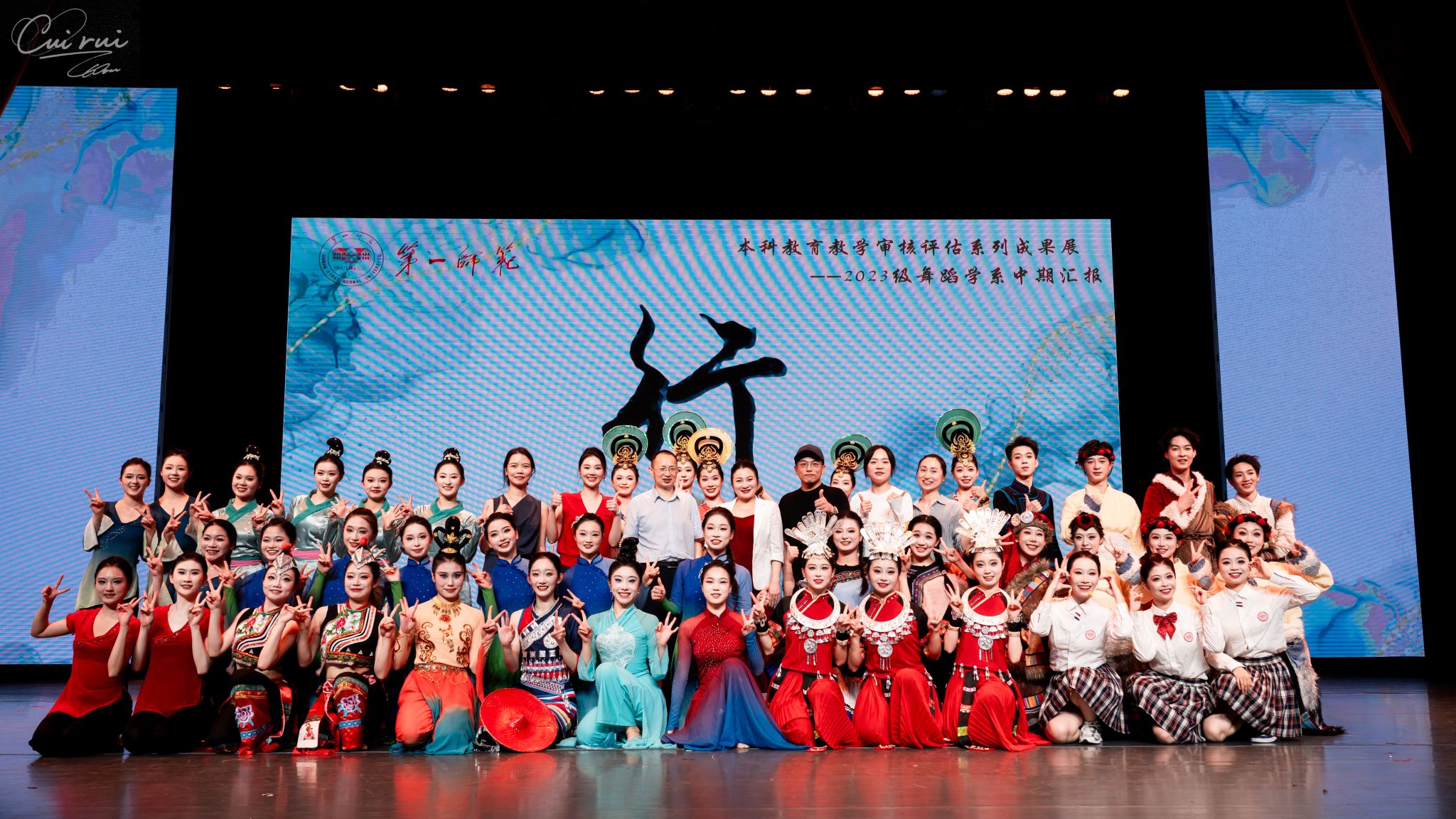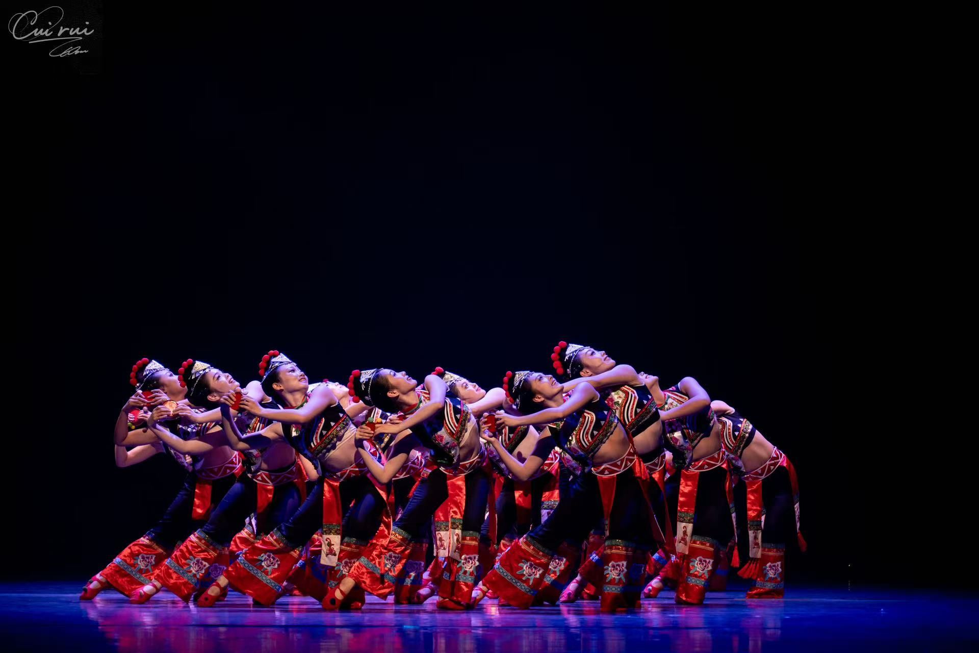 23舞蹈1班的学子以情景式舞蹈剧场为笔,勾勒出一条横跨古今、虚实相生的时空长廊,引领现场观众共同踏足山河的肌理,聆听生命深处的磅礴诗行。整场晚会宛如流动的东方诗卷。古典身韵的含蓄悠长与现代审美的锐利锋芒在舞台上奇妙相融、和谐共鸣。翩跹雅韵,不只是技巧的炫示,更是千年风华在新时代语境下的深情回响。每一次云步流转,皆似在宣纸上晕开的墨痕,无声诉说着东方式的浪漫哲思;每一次翻飞腾挪,都如刀锋掠过时光之石,铿锵刻印下华夏风骨的遒劲力道。敦煌飞天的飘逸、深闺霓裳的叹息、江南水墨的温婉……那些被岁月尘封的故事,在肢体语言中重新苏醒。我们走进山林,在苗疆少女的银饰叮咚中听见自由;登上高原,在额头紧贴的大地弧度里,触摸信仰的灼热;我们触摸非遗,用舞蹈的温度连接起56个民族的心跳!原来,舞蹈不仅是技艺,更是文明的密码、生命的诗行!