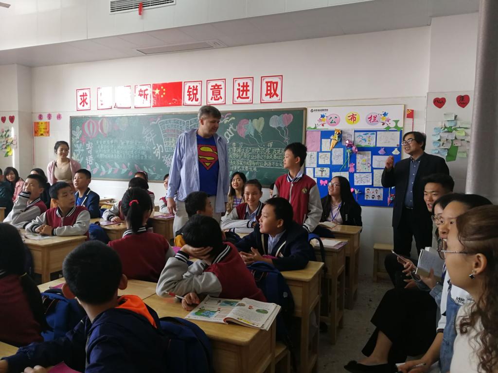 外教Mark为小学六年级学生讲授了主题为“How are you?”口语课,Mindia为初中二年级学生讲授了主题为“What Mothers said to Eat”阅读课。两位外教聚焦教学目标,以任务为驱动,以活动为载体,运用幽默风趣的语言,配以丰富的面部表情、夸张的肢体动作,把枯燥的语言学习变成一堂生动、活泼的学生自我展示课。课堂上学生为外教的激情所深深感染,他们争先恐后举手发言,生怕失去表现自己的机会。六年级的英语课教师这样说:“外教太神奇了!连不自信、不爱答问的同学也举手发言了。”初中部的一位英语教师则说:“原来阅读课也可以上得如此有趣,整个课堂怎能一个 “High”字了得!课后,我们分小学、初中两个组开展了教学研讨。研讨会上,成章学校的英语教师就英语语音、阅读、教材使用、测试、教师专业发展等方面提出了一系列问题,两位外教、陈梦稀、唐文杰、何晓斓进行了耐心细致的解答。