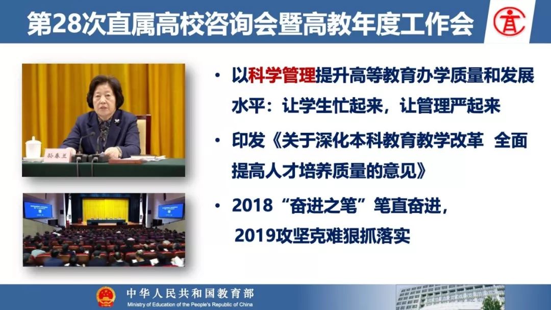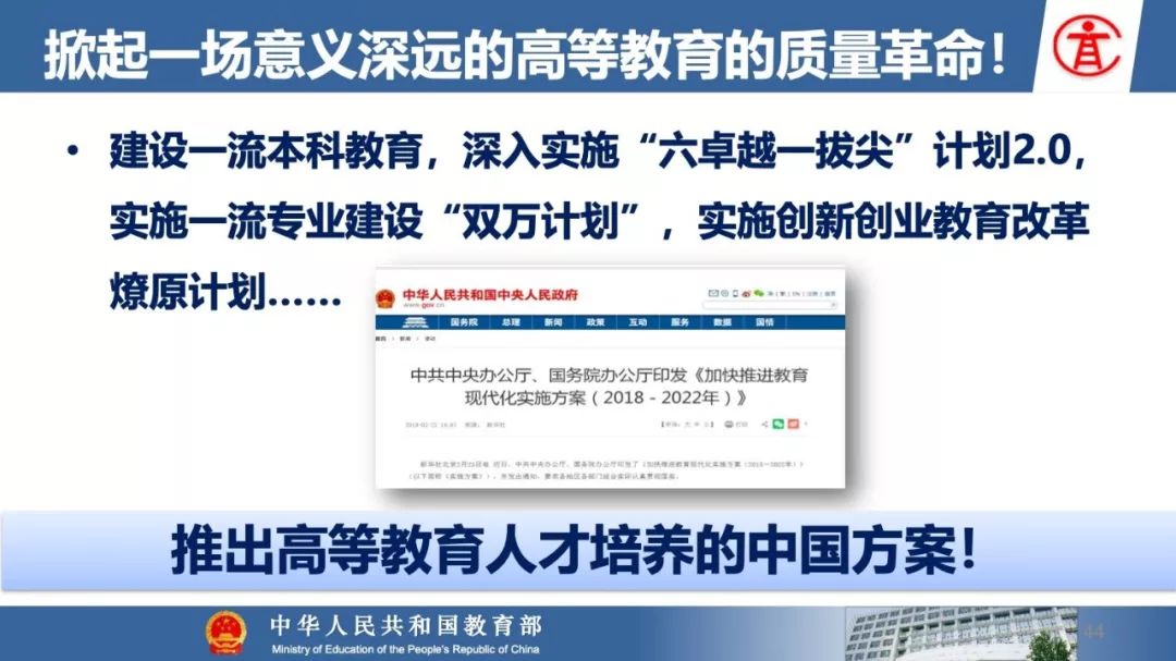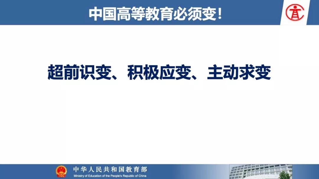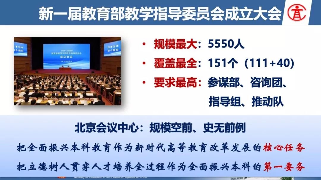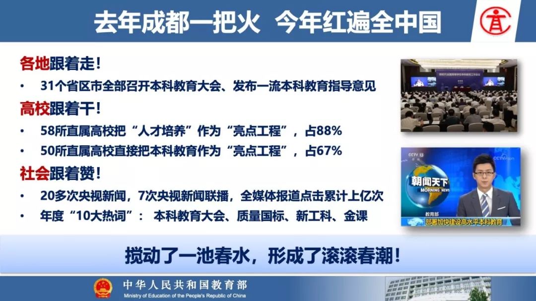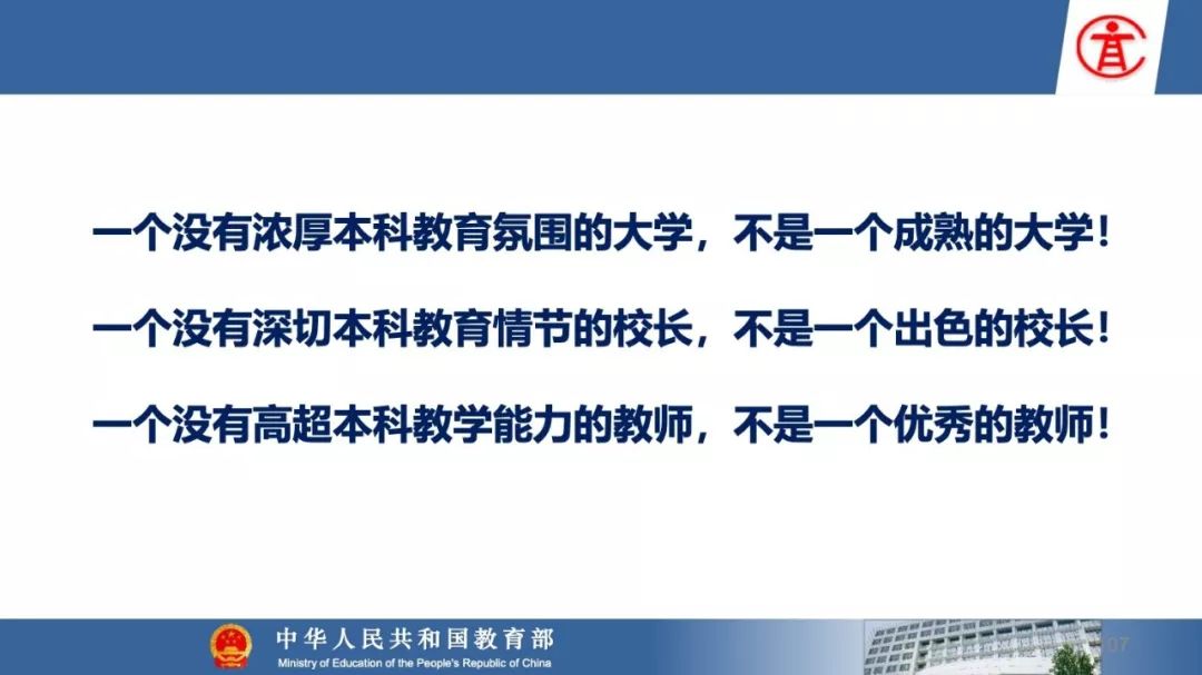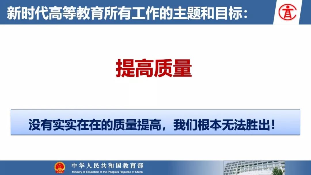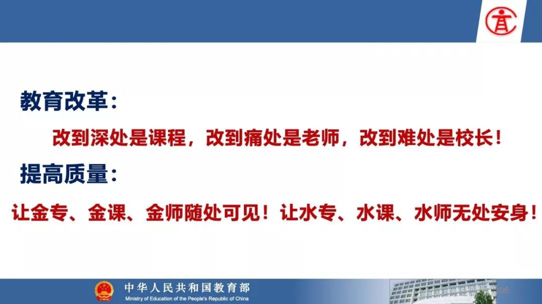 报告指出:要精准把握高等教育发展大势,超前识变、积极应变、主动求变;提到本科教育呈现新局面,“以本为本,四个回归”理念深入人心,“三个不合格、四个首先”得到有效落实;最后强调要通过一系列行动,把本科教育质量实实在在提起来,学校要狠抓教学改革,让金专、金课、金师随处可见!