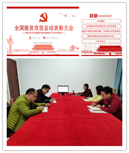 4月16日下午,教学评估与教师教学发展中心党支部开展“学史增信”专题学习活动,学习传达习近平总书记在全国脱贫攻坚总结表彰大会上的讲话精神。专题学习活动由支部书记李婷主讲,支部全体党员参加。